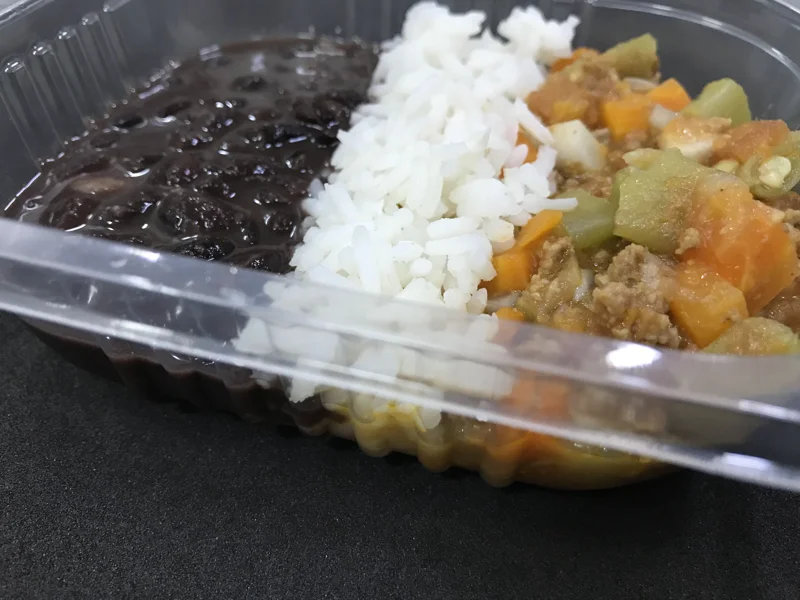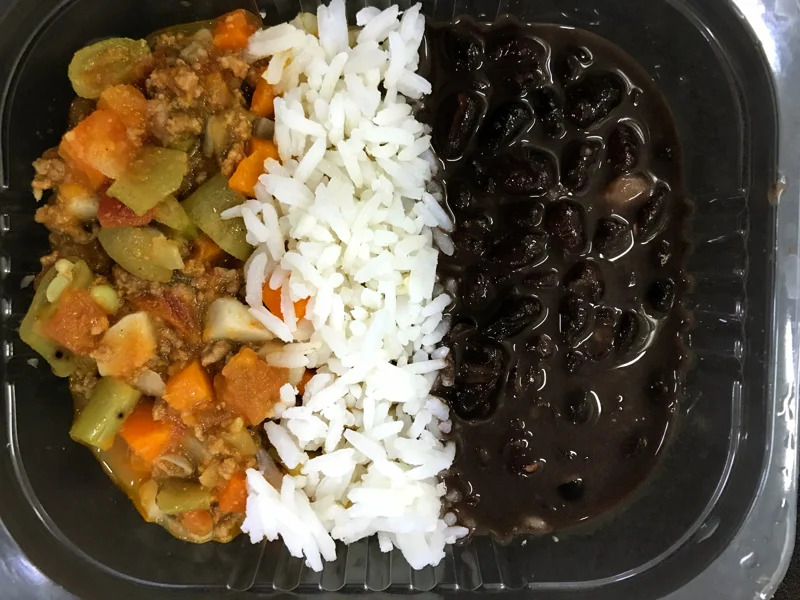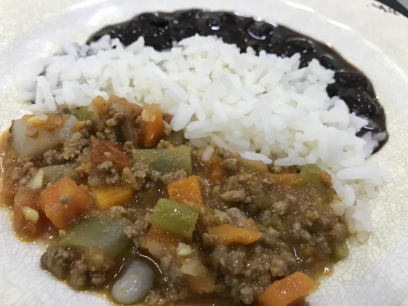 Carne moída com legumes (inhame, cenoura e vagem) – Acompanha arroz branco e feijão preto