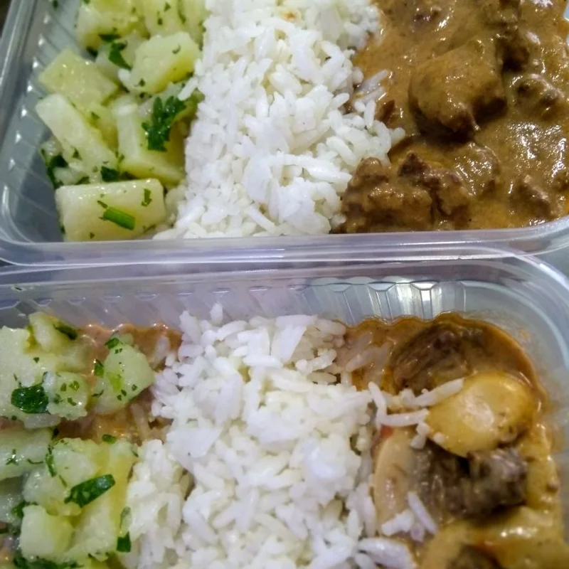 Ingredientes: Patinho, arroz branco, batata inglesa, creme de leite fresco, tomate, cebola, alho, óleo vegetal, salsinha, sal, cominho, louro em pó