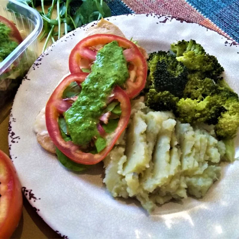 Frango caprese com purê de batata doce e brócolis no vapor