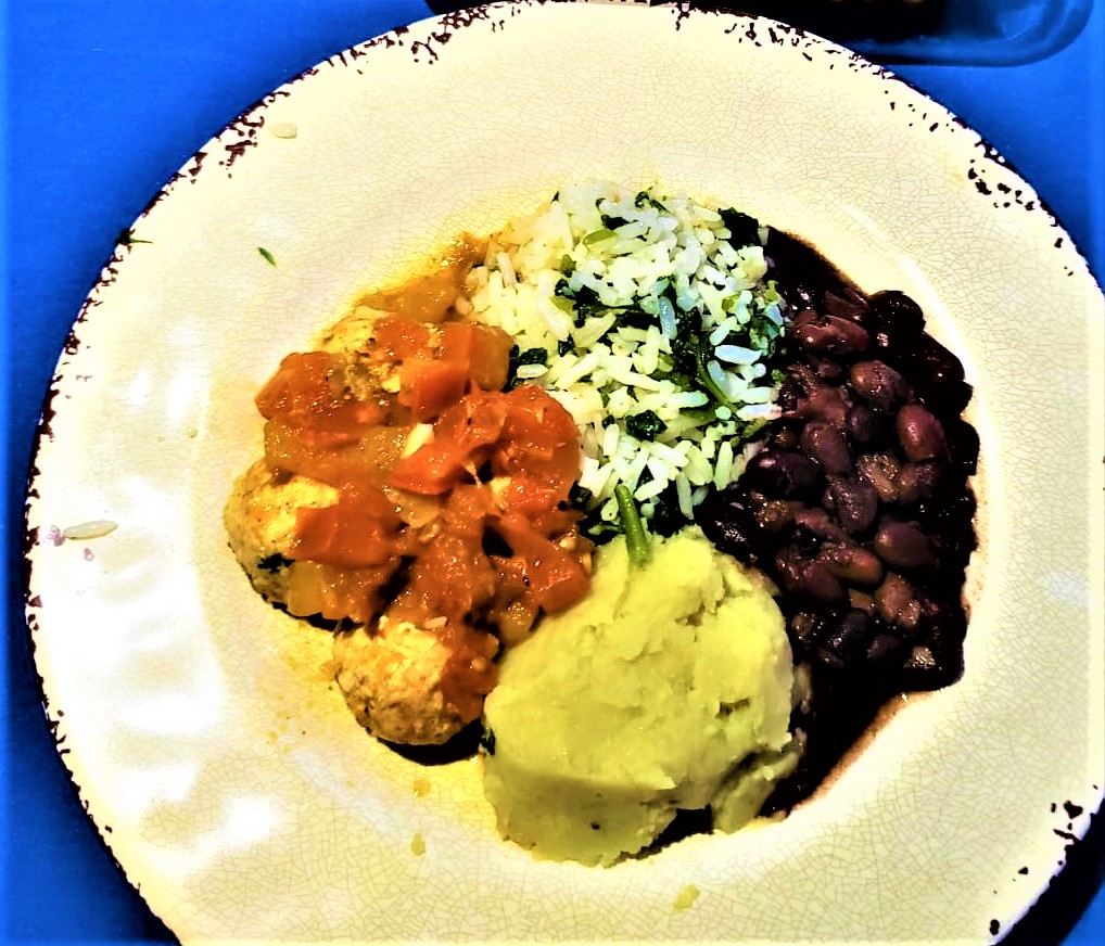 Mini almondegas de frango ao molho pomodoro com purê de batata doce, arroz de espinafre e feijão preto
