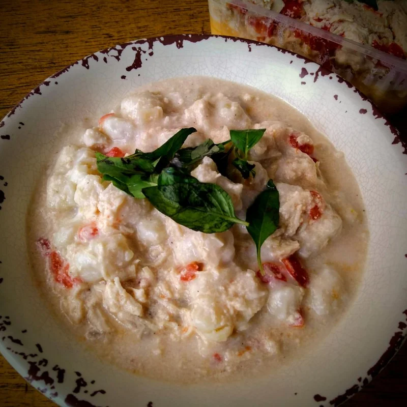 Nhoque de baroa ao molho de requeijão com frango desfiado