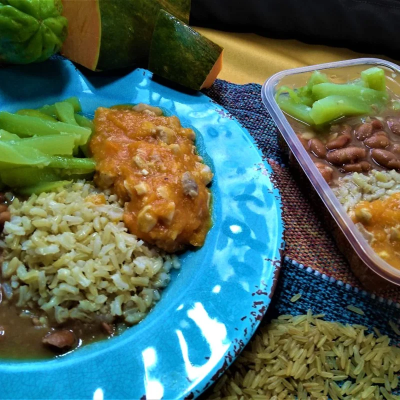 Ingredientes: Filé de sobrecoxa, feijão carioca, arroz integral, abóbora, chuchu, cebola, alho, óleo vegetal, cominho, louro em pó, sal